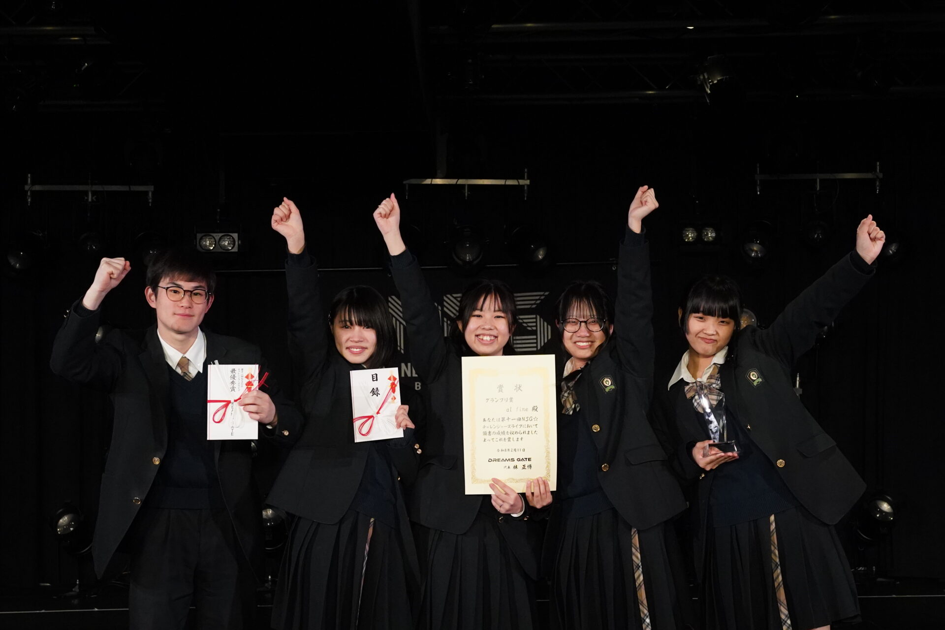 第11回NSGチャレンジャーズライブにてグランプリを受賞いたしました、al fineと申します。 このたびは栄えある賞に選んでいただき、心より感謝申し上げます。 これからも、私たちの音楽が皆さまの心に届くよう、より一層精進してまいります。 お聴きくださった皆さま、共演してくださった皆さま、そしてNSGチャレンジャーズライブに関わってくださったすべての皆さまに、心より御礼申し上げます。 本当にありがとうございました。